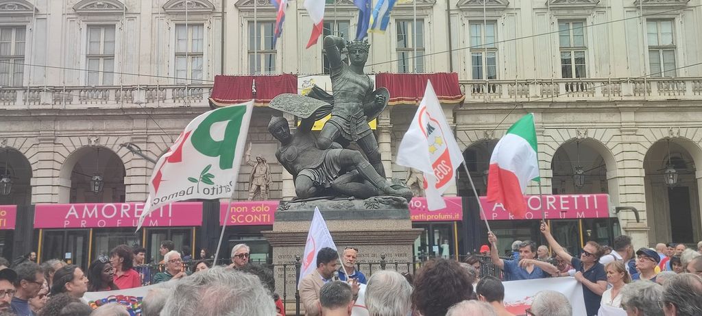 A Torino circa 200 manifestanti si sono ritrovati dalle 17.30 in piazza Palazzo di Città, di fronte al Comune, per gridare contro il premierato e l'autonomia differenziata e la difesa della Costituzione.