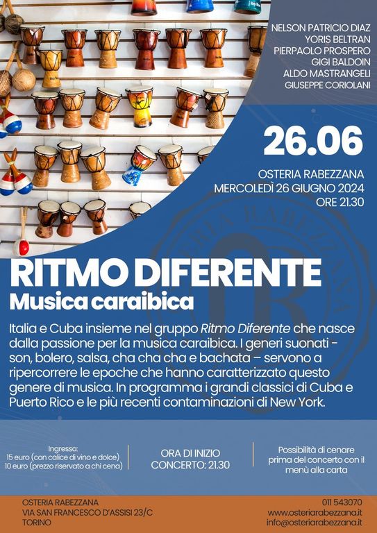 Italia e Cuba insieme nel gruppo “Ritmo Diferente” che nasce dalla passione per la musica caraibica. I generi suonati - son, bolero, salsa, cha cha cha e bachata – servono a ripercorrere le epoche che hanno caratterizzato questo genere di musica. In programma i grandi classici di Cuba e Puerto Rico e le più recenti contaminazioni di New York.