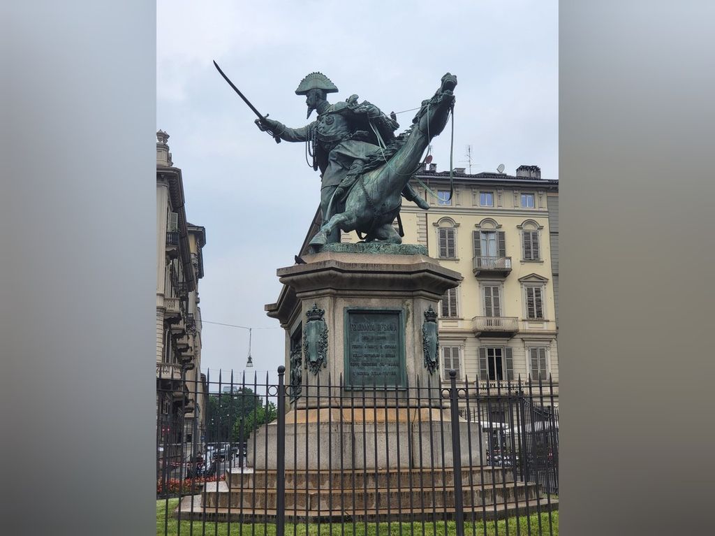 Eretta dallo scultore della Casa Reale Alfonso Balzico nel 1877, essa lo ritrae, appunto, in divisa militare e con la spada sguainata, mentre incita i suoi soldati a riprendere la Bicocca. Rende omaggio al suo intrepido coraggio e resistenza in battaglia, qualità avvalorate dal fatto che ben tre cavalli morirono sotto di lui.