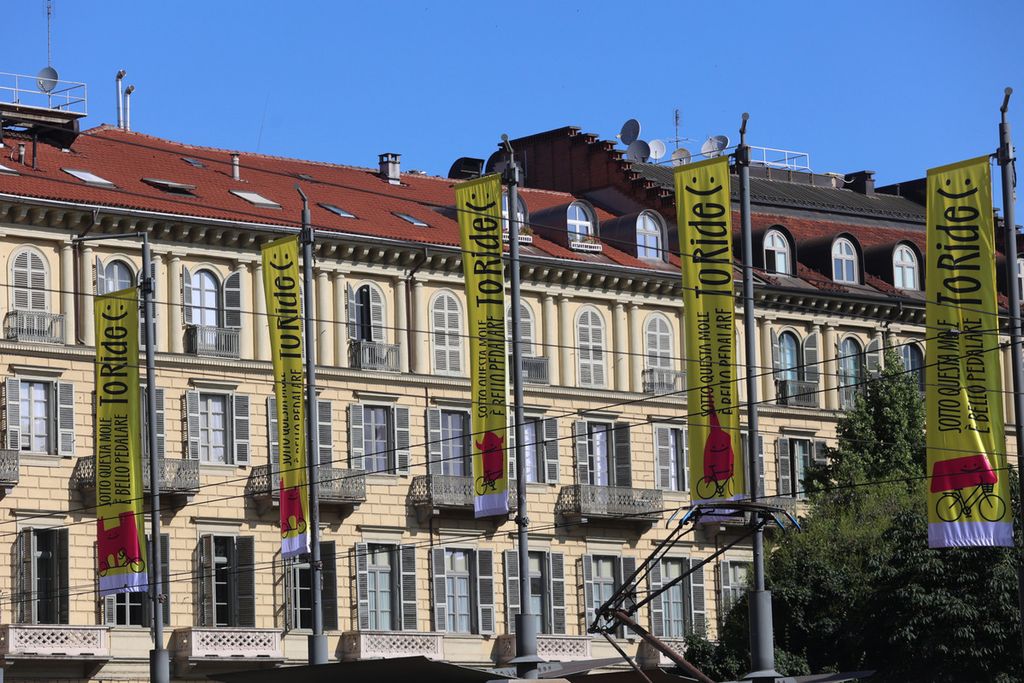 Anche questa sera e domani, la Mole Antonelliana e i ponti sul Po saranno illuminati di giallo. Il giallo è anche il colore dominante della seconda fase della campagna di comunicazione “ToRide :-) Sotto questo sole è bello pedalare”, che ha accompagnato i torinesi nella lunga attesa dell’arrivo di tappa con un ricco programma di eventi. Le rotonde lungo il percorso e diverse aiuole del centro sono state inoltre adornate da suggestive composizioni floreali a tema, realizzate con l’utilizzo di oltre 14mila piante stagionali, e arricchite dalle sagome di ciclisti in bicicletta. Alcune piazze del centro, infine, sono state arricchite da cestini fioriti e installazioni floreali che rendono i luoghi aulici ancora più belli e fotografabili.