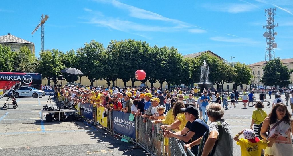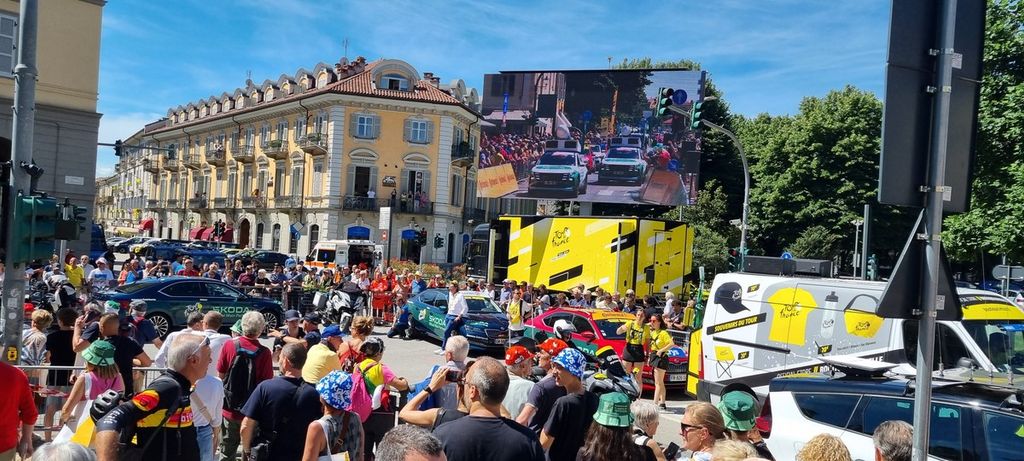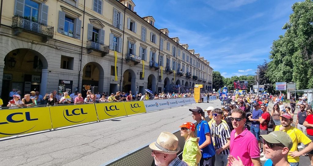 Due ali di folla hanno accolto i ciclisti del Tour de France per la passerella in centro città in vista della partenza da Ponte San Martino della Pinerolo-Valloire.