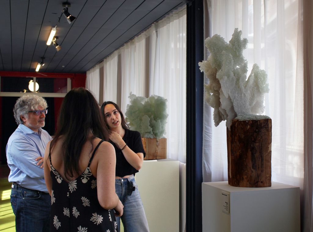 Le sculture sono realizzate con lamine sottili di resina trasparente e graniglia di vetro di Murano di dimensioni e calibro differenti. Da qualsiasi angolazione le si guardi, la Galaverna di Massimo Sacchetti ci restituisce a sua volta una parte, un colore, un dettaglio sempre diverso di sé.