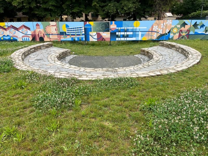 L’installazione artistica è un’opera realizzata sul divisorio tra il nuovo parco e l'area stralciata dal progetto in fase di progettazione riservata per accertamenti archeologici. Il disegno è stato realizzato lavorando su moduli scomponibili, in modo che, una volta completato il parco, i pannelli possano essere riposizionati all’interno dello stesso. Formata da 26 pannelli di circa 2x1,8 m per un totale di 52 metri, è un flusso unico di immagini che secondo il senso di lettura racconta la storia del luogo attraverso 5 tematiche: