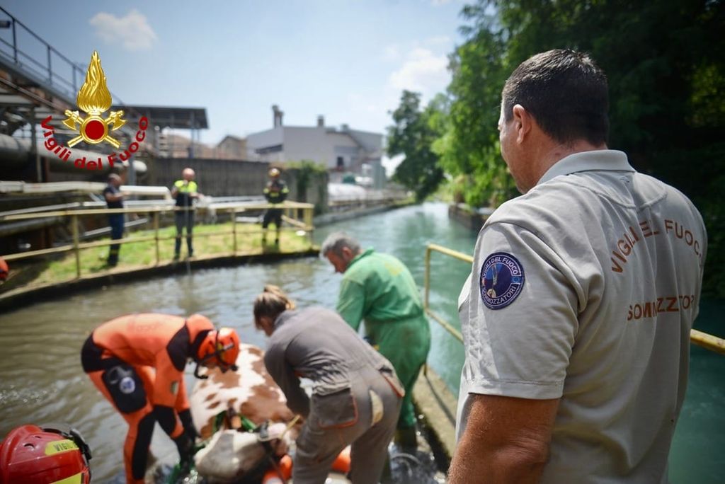 Mucca cade nel canale: i sommozzatori la recuperano usando delle larghe fasce per imbrigliarla [VIDEO]