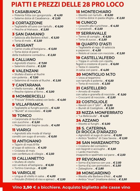 Si apre sabato 7 settembre dalle 18:30 alle 23:30 (i dolci verranno serviti fino alle 24). Domenica 8 settembre, dopo la sfilata contadina del mattino che partirà alle 9.30 da corso Matteotti, sarà possibile pranzare dalle 11:30 alle 22:00. I vini Doc e Docg delle aziende aderenti al Consorzio Barbera d’Asti e Vini d’Asti e del Monferrato saranno disponibili, con acquisto del biglietto presso le “casse vino” al prezzo unico di 2,50 euro. La somministrazione avverrà esclusivamente presso le casette delle Pro Loco, presentando il biglietto acquistato.