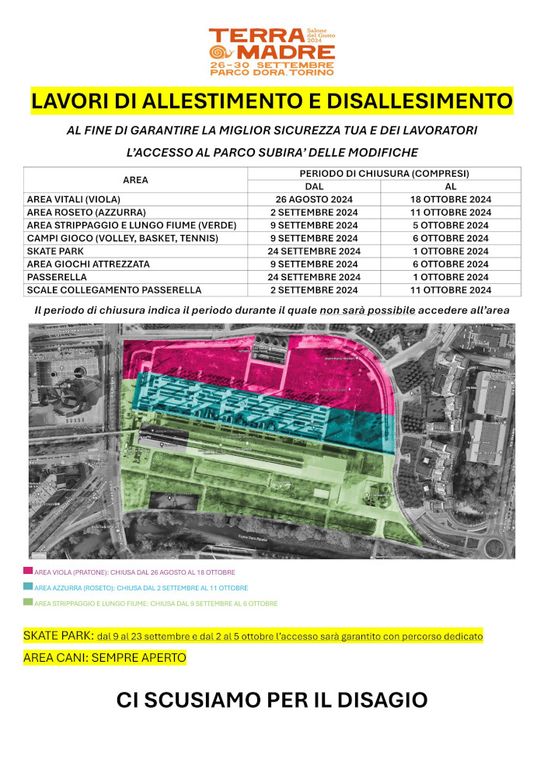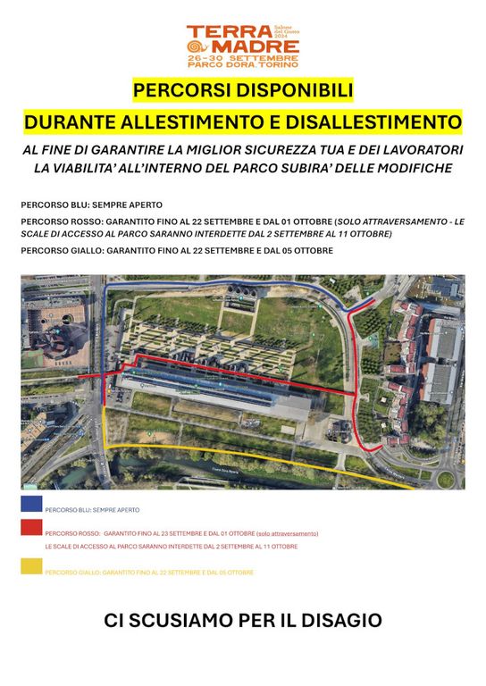 Nonostante i disagi che sicuramente la chiusura del parco arrecherà ai suoi abituali frequentatori e non solo, durante le fasi di allestimento e smontaggio e nel corso di Terra Madre verranno garantiti alcuni passaggi: un percorso sempre aperto che, dall'ingresso di via Verolengo, consente di costeggiare il parco da nord e arrivare in via Borgaro (evidenziato in blu sulla seconda mappa in allegato), un percorso che, dagli ingressi di via Verolengo e via Orvieto, consente di attraversare l'area Roseto e arrivare in via Borgaro all'altezza della Chiesa del Santo Volto (evidenziato in rosso, garantito fino al 22 settembre e dal 1° ottobre) e un percorso che, dalla rotonda di corso Mortara, consentirà di attraversare il parco lungo la Dora arrivando su corso Umbria (evidenziato in giallo, garantito fino al 22 settembre e dal 5 ottobre). Le 3 vie saranno aperte in entrambe le direzioni.