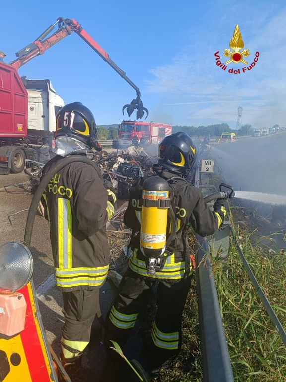 I vigili del fuoco sono intervenuti poco prima delle 10 di oggi, martedì 10 settembre, a Trofarello, in via Leonardo da Vinci, per l'incendio del carico di un camion destinato al trasporto di rottami metallici.