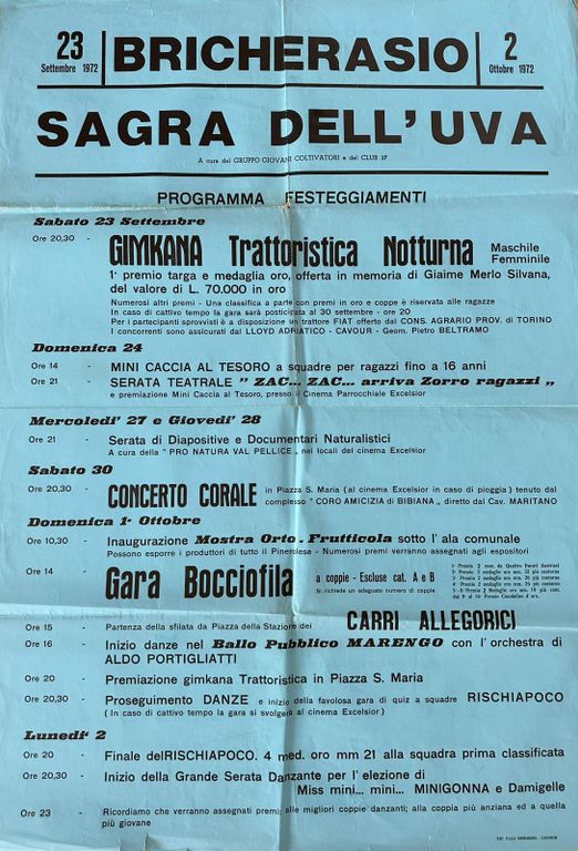 “La ricerca ci ha permesso di rintracciare eventi che sono andati perduti e di cui, in alcuni casi, non si era conservata la memoria come la Caccia al tesoro in bicicletta” rivela. Tra le iniziative abbandonate per ragioni di sicurezza c’è la gimkana trattoristica che veniva proposta in occasione della Sagra dell’Uva. È stato ritrovato materiale anche sulla festa di San Bernardino la cui ultima edizione si è svolta nel 1984 e che la Pro loco ha di nuovo voglia di organizzare: “Il suo programma era un mix di eventi musicali, culinari e religiosi come la processione degli incappucciati. Stiamo valutando se sia possibile riproporre l’evento in una chiave nuova”.