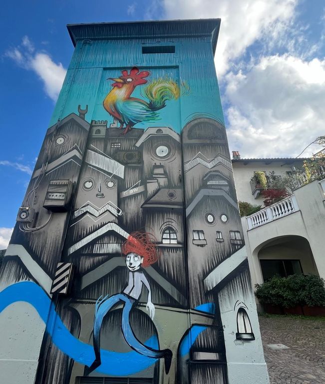 Il murale, realizzato dallo street artist Mr Fijodor - in collaborazione con Luca Mostaccioli e con l’apporto dei pazienti di Fermata d’autobus Onlus - rappresenta alcune fra le principali peculiarità di Rivarolo Canavese: il gallo simbolo della Città, il Castello di Malgrà, le chiese barocche, il torrente Orco, un simpatico riferimento ai “Biautagambe” (che in dialetto significa ciondola gambe, derivato dalla tradizione secondo la quale era abituale passatempo dei Rivarolesi sedersi sul Ponte della Botteria, sopra la roggia comunale).