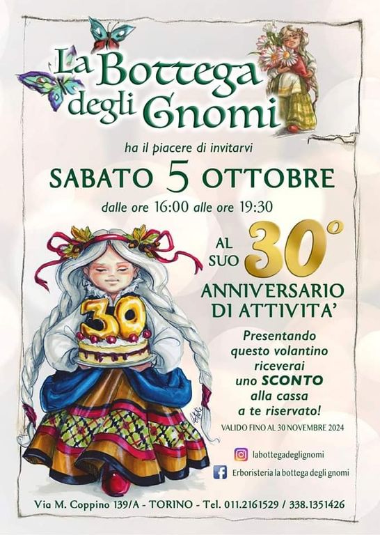 Non perdere l’occasione di partecipare a questo evento speciale! Sabato 5 ottobre, dalle ore 16 in Via Coppino 139/A, vieni a festeggiare con noi i 30 anni di attività de La Bottega degli Gnomi e approfitta delle promozioni esclusive.
