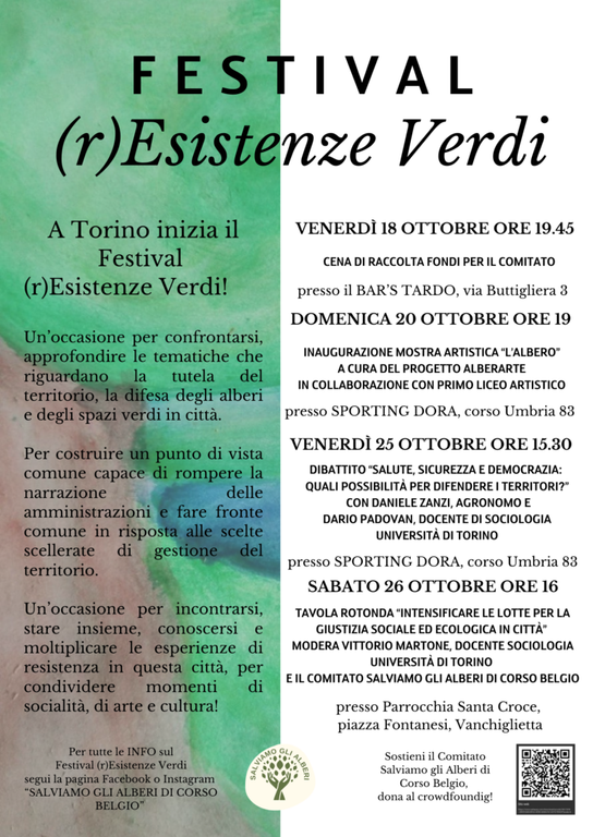 Organizzato dal Comitato Salviamo gli alberi di corso Belgio, venerdì 18 ottobre prende il via il primo – itinerante - “Festival (r)Esistenze Verdi”. Un'occasione per incontrarsi, stare insieme, conoscersi, per condividere momenti di socialità, di arte e cultura ma anche per confrontarsi tra cittadini (attivisti e no), approfondire le tematiche che riguardano la tutela del territorio, la difesa degli alberi e degli spazi verdi in città: per costruire un punto di vista comune capace di rompere la narrazione delle amministrazioni e fare fronte comune in risposta alle scelte scellerate di gestione del territorio.