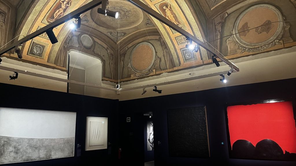 Il “cardine della mostra”, come dichiara il co-curatore Barbero, si ha nel confronto tra due protagonisti indiscussi: Lucio Fontana e Alberto Burri; 11 emblematiche opere entrano in dialogo e, in particolare, si stabilisce un inedito accostamento tra il Concetto spaziale. Teatrino del 1965 del primo e il Nero cretto G5 del 1975 del secondo.