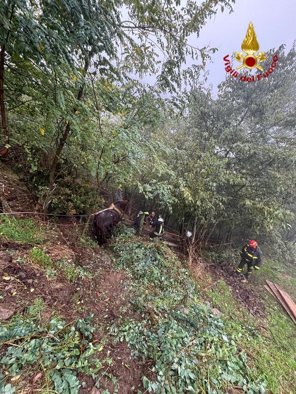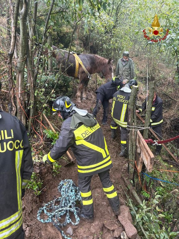 Anziana cavalla resta bloccata nel fango: i Vigili del fuoco la portano in salvo