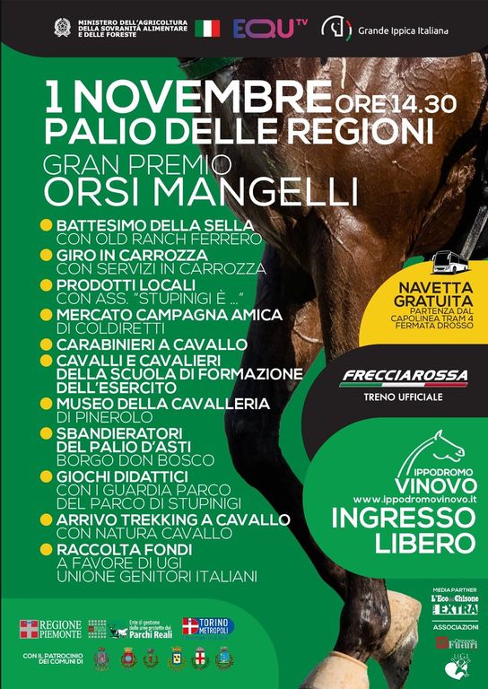 Tutta la giornata di corse e di eventi, che avrà come suo perno centrale il Gran Premio Orsi Mangelli sarà anche l'unica tappa piemontese per il Palio delle Regioni 2024/2025. Un'iniziativa promossa dal MASAF, Ministero dell'Agricoltura, della Sovranità Alimentare e delle Foreste che ha previsto 21 appuntamenti di trotto e galoppo su tutto il territorio nazionale con lo scopo di esaltare i valori fondanti dell'ippica insieme alle specificità dei territori, creando una sinergia tra natura, turismo, sport, cultura e tradizione.