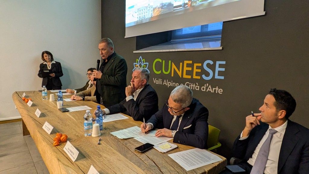 Il progetto “Ski Route Montagna Cuneese Inverno 2025” - sostenuto da Camera di commercio di Cuneo, ATL del Cuneese ed Ente Turismo Langhe Monferrato Roero - è stata presentato ieri, 21 ottobre, presso la sede ATL di Cuneo alla presenza dell’Assessore regionale Paolo Bongioanni (Commercio, Agricoltura e Cibo, Caccia e Pesca, Parchi), del Presidente della Camera di commercio di Cuneo, Luca Crosetto, del Presidente del C.d.A. di Visit Piemonte, Beppe Carlevaris; del direttore di Cuneo Airport, Anna Milanese; dei presidenti delle ATL del Cuneese e Langhe Monferrato e Roero, Mauro Bernardi e Mariano Rabino, di Danilo Turletto di ITAKA, del sindaco di Limone Piemonte, Massimo Riberi e Antonella Zanotti AD della società impianti di Limone LIFT.