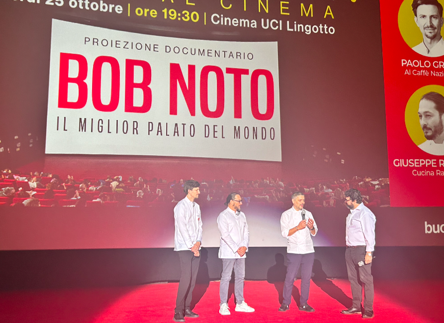 Carlo Cracco, Matteo Baronetto, Paolo Griffa e Giuseppe Rambaldi hanno presentato le loro creazioni durante la serata Chefilm!, all'interno della rassegna Buonissima 2024, durante la quale è stato proiettato il documentario su Bob Noto realizzato da Francesco Catarinolo.
