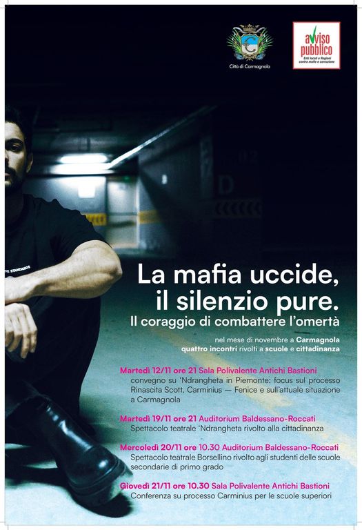 Quattro eventi – un convegno, due spettacoli teatrali e un incontro con le scuole – compongono la rassegna “La mafia uccide, il silenzio pure. Il coraggio di combattere l’omertà”. L’iniziativa è voluta e ideata dal Comune di Carmagnola in collaborazione con l’associazione Avviso Pubblico. Enti locali e Regioni contro mafie e corruzione.