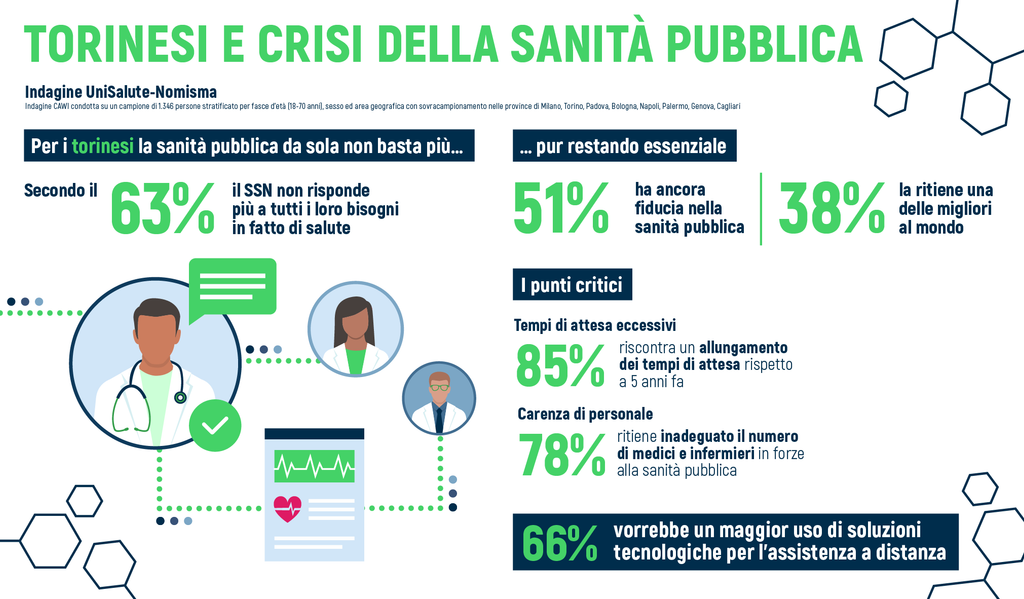 I torinesi sono sempre più preoccupati dalla crisi in cui versa la sanità pubblica, con la maggioranza di essi che non la ritiene più in grado di rispondere, da sola, a tutti i loro bisogni in fatto di salute. A rilevarlo è l’ultima indagine dell’Osservatorio Sanità di UniSalute, che è tornata a sondare l’opinione degli abitanti di Torino sullo stato del Servizio sanitario nazionale.