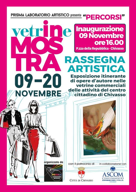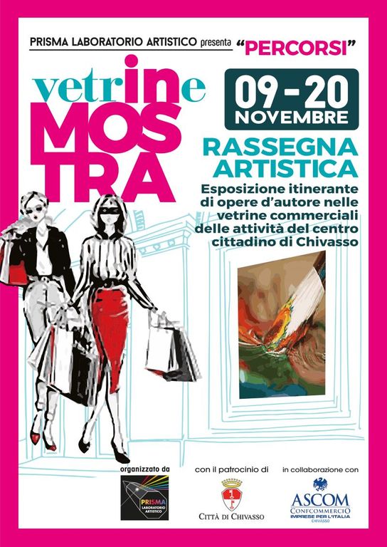 “VETRINE in MOSTRA” fa parte di “PERCORSI” ed è una rassegna artistica itinerante, una collettiva diffusa, promossa ed organizzata da Prisma con la collaborazione dei commercianti della bellissima città di Chivasso, che hanno aderito in più di 100, e la partecipazione di quasi 50 artisti del territorio.