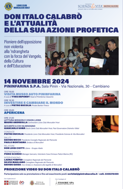 Il 14 novembre 2024 dalle ore 19.00, presso la sede della Pininfarina di Cambiano, in via Nazionale 30, si terrà un evento dedicato a Don Italo Calabrò e all'attualità della sua azione profetica.