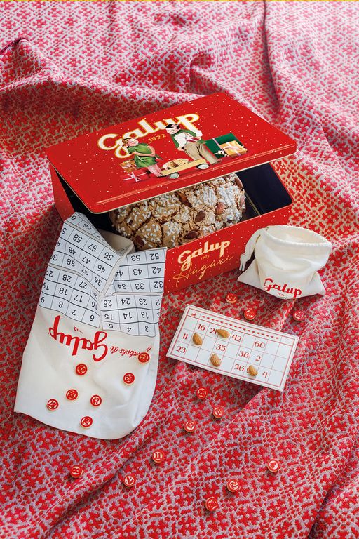 IL PANETTONE GALUP FA TOMBOLA! è dunque la proposta che racchiude, in un’elegante confezione in latta rossa decorata con elementi litografati, il Panettone Gran Galup – nato dall’antica ricetta di Monsù Ferrua con canditi freschi e uvetta di primissima scelta nel morbido impasto, guarnito con glassa alla Nocciola Italiana “Tonda Gentile Trilobata”, arricchita da mandorle intere e granella di zucchero – e la tombola composta da un tabellone in tessuto, le cartelle da gioco e un sacchetto di stoffa con i numeri in legno: una sorpresa per rendere unica questa edizione.