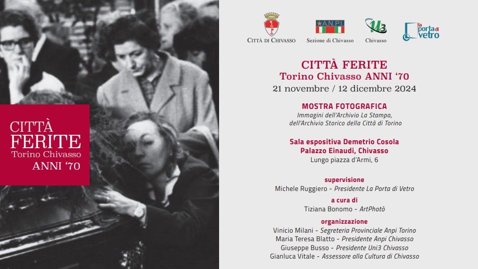 Dal 22 novembre al 12 dicembre Palazzo Einaudi di Chivasso ospita la mostra storico culturale “Città ferite. Torino-Chivasso anni ‘70”, ideata dall’Associazione La Porta di Vetro e curata da Michele Ruggiero, presidente e socio fondatore dell’Associazione, Tiziana Bonomo di ArtPhotò, in collaborazione con ANPIUnitre e amministrazione comunale di Chivasso.