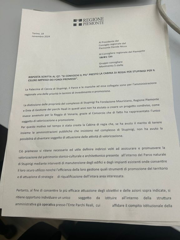 Il progetto Stupinigi 2030, che punta a fare della Palazzina di Caccia la nuova Venaria, è considerato dal governatore Alberto Cirio uno dei punti qualificanti del suo secondo mandato alla presidenza del Piemonte. Oggi la questione è approdata in Consiglio regionale, con l'interrogazione a risposta immediata presentata da Valentina Cera (AVS), che chiedeva tempi e investimenti certi e che diventasse operativa la cabina di regia, per procedere agli interventi a favore della residenza sabauda del Comune di Nichelino.