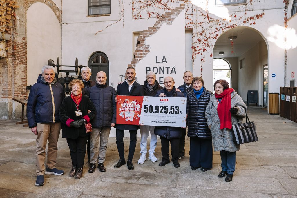 Questa mattina il direttore delle Politiche sociali di Nova Coop Carlo Ghisoni e il responsabile area Ipermercati Online e Innovazione, Cristian Laurenza, assieme a una delegazione di soci Coop volontari, hanno simbolicamente donato al Sermig Arsenale della Pace un assegno di 50.925,53 euro, corrispondente all’importo totale dei premi non ritirati del concorso “Spesa che sorpresa”, terminato il 26 giugno scorso.