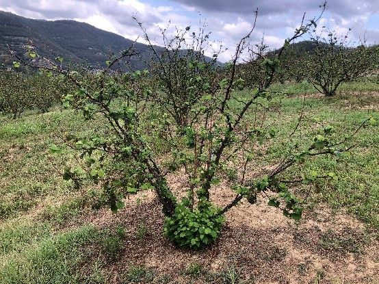 Nei giorni successivi all’evento, i tecnici di Agrion hanno avviato monitoraggi puntali per valutare i danni causati ai corileti, soprattutto a livello della chioma e del legno, visto il risultato dell’apparato fogliare fortemente compromesso e il conseguente rischio dell’attività fotosintetica della pianta (Fig.1- 2). Solitamente le operazioni di cimatura e capitozzatura di forte intensità, in caso di elevate temperature subito dopo ad un evento grandinigeno, sono sconsigliate per non stressare e debilitare ulteriormente le piante, ma in questo caso la scelta è stata dettata dalla volontà di testare la risposta delle piante in condizioni limite.