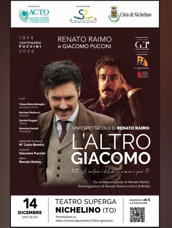 In occasione del centenario dalla morte di Giacomo Puccini, sabato 14 dicembre, alle ore 21, presso il Teatro Superga di Nichelino, andrà in scena “L’Altro Giacomo”, lo spettacolo teatrale di Renato Raimo, noto attore italiano, celebre anche per il suo ruolo nella soap “CentoVetrine”.