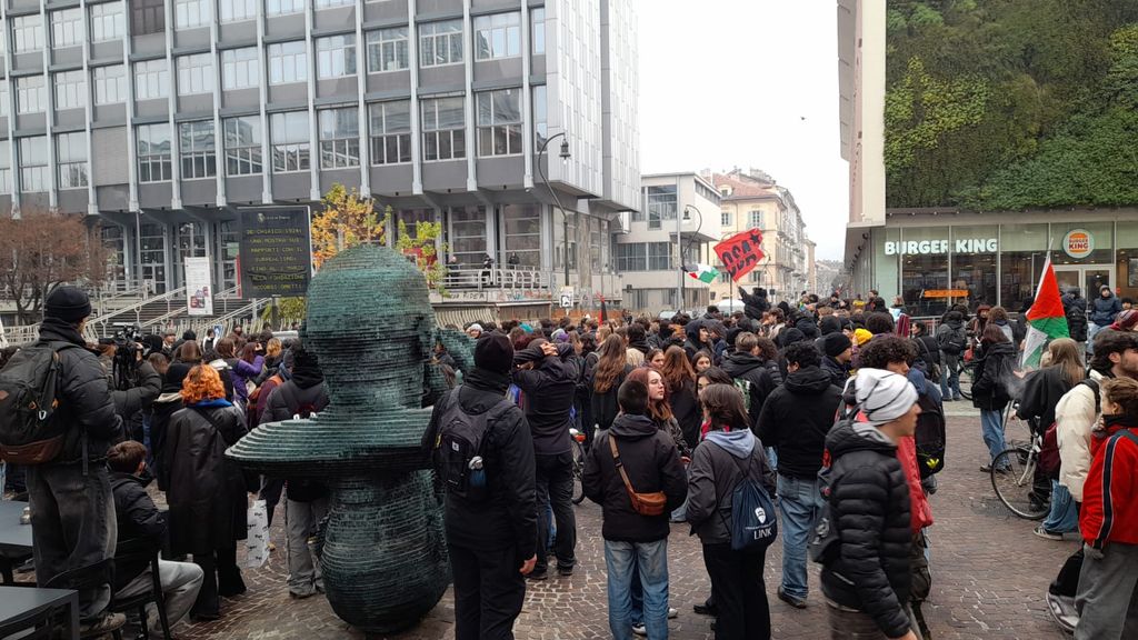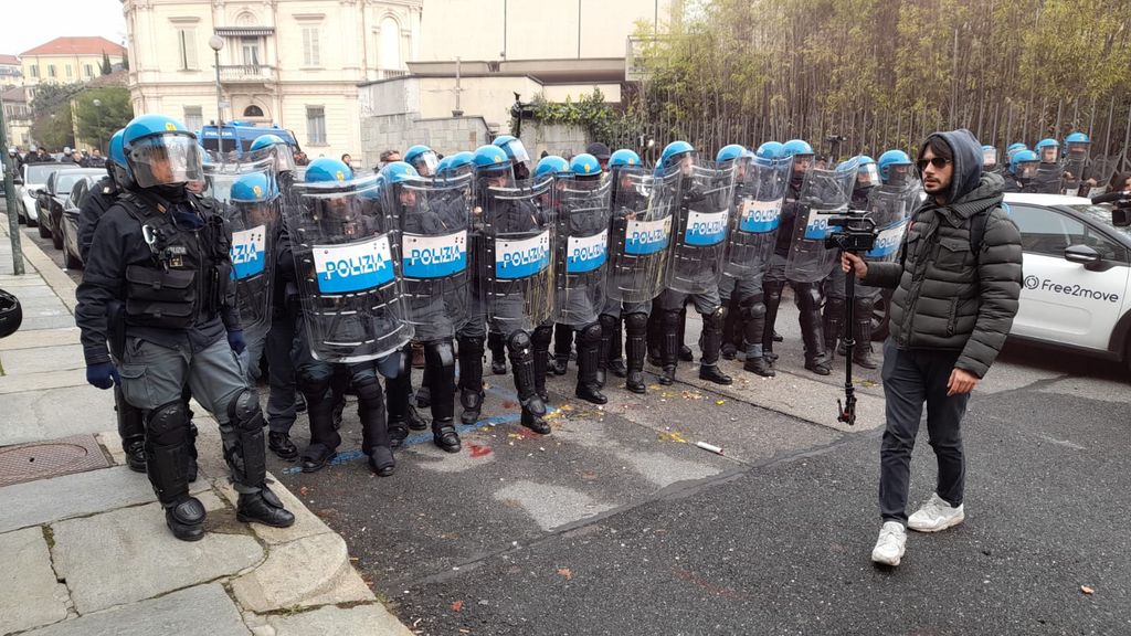 Ancora un venerdì "caldo" nelle strade di Torino: dopo i disordini delle scorse settimane grande schieramento di forze dell'ordine. Tanti gli slogan contro Israele e contro il ministro Valditara. Lo Russo: "Imbrattamenti, danneggiamenti e violenza vanno condannati"