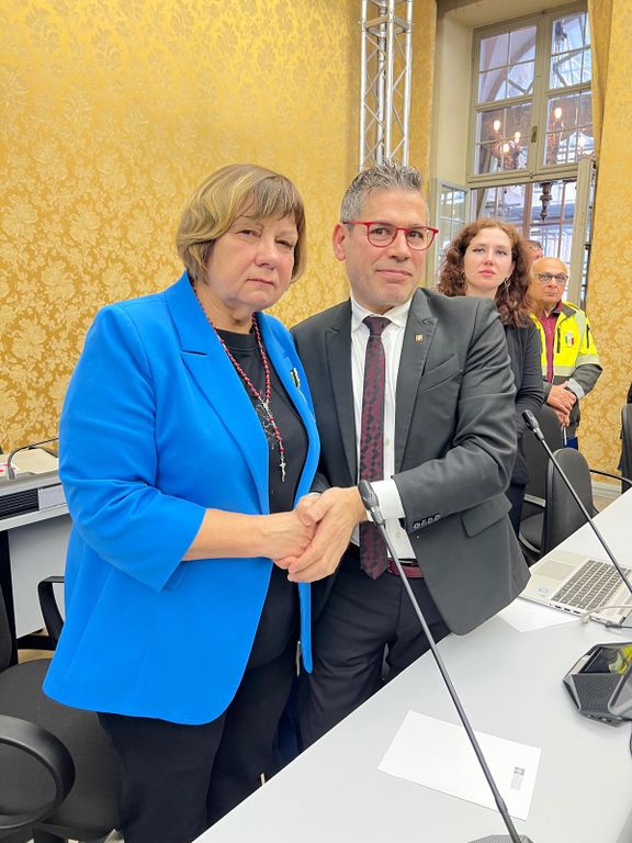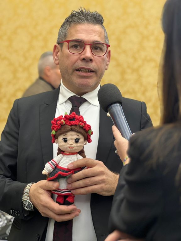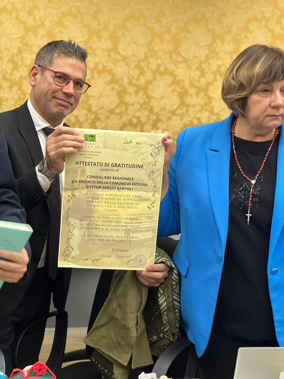 La sindaca Karabut ha voluto omaggiare Sergio Bartoli con alcuni doni: una maglia fatta a mano e una pergamena di ringraziamento. Allo stesso modo, la sindaca ha donato al Consiglio regionale una pergamena e una ceramica dipinta a mano.