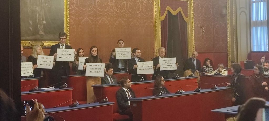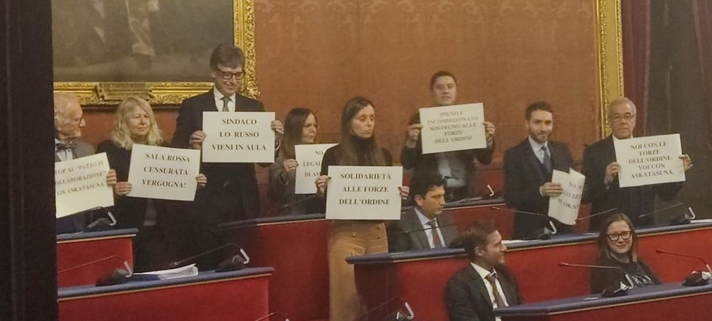 Da qui la protesta della minoranza - escluso il Movimento 5 Stelle -, che si è alzata in piedi mostrando dei cartelli dopo l'intervento del consigliere di Fratelli D'Italia Ferrante De Benedictis. "Sala Rossa censurata, vergogna", "Sindaco Lo Russo vieni in aula" e "Noi con le forze dell'ordine, voi con Askatasuna" si è letto sui fogli mentre la presidente del Consiglio comunale Maria Grazia Grippo ha sospeso la seduta.