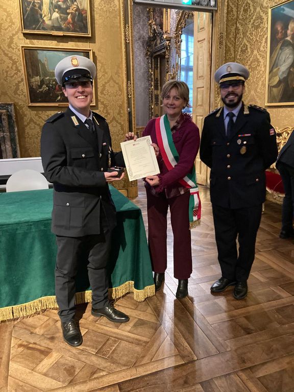 "A seguito della grave esondazione del fiume Frejus, unitamente ai colleghi, - recita la motivazione - interveniva prontamente contribuendo ai primi soccorsi e alla messa in sicurezza della popolazione e degli sfollati. Tale opera proseguiva incessantemente nei giorni a venire a presidio della 'zona rossa' per garantire la sicurezza pubblica".