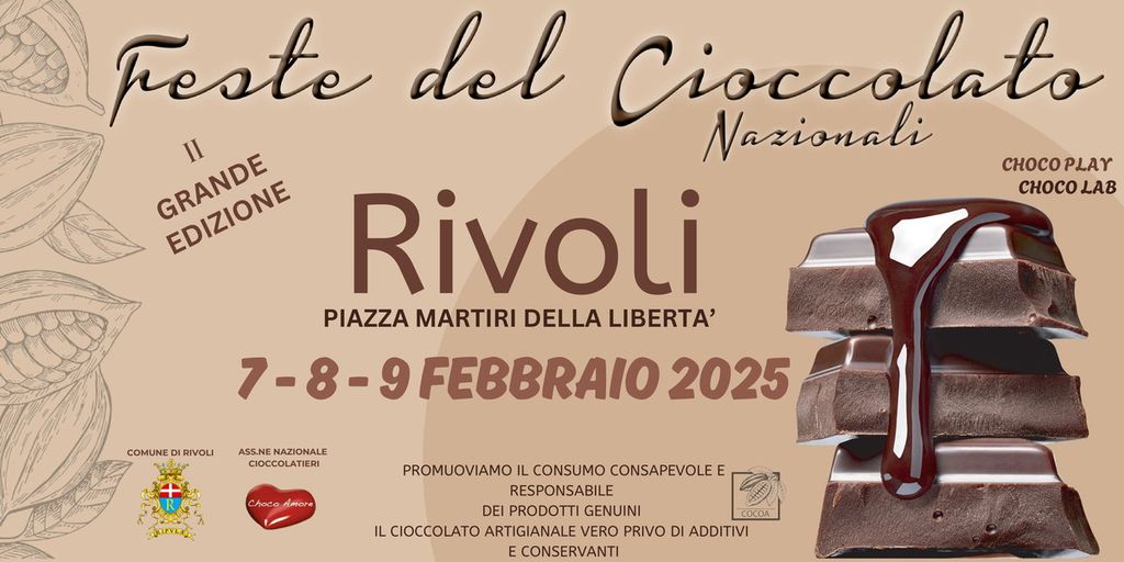Arriva a Rivoli, in Piazza Martiri della Libertà, dal 7 al 9 Febbraio 2025, con il prezioso patrocinio del Comune, la II grande edizione della Festa del Cioccolato Artigianale.