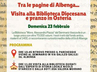 L'Osteria del Tempo Stretto vi invita a un'esperienza unica, un connubio tra storia e gastronomia nel cuore di Albenga. Domenica 23 febbraio, immergetevi nelle pagine del passato con una visita esclusiva alla Biblioteca Diocesana "Mons. Alessandro Piazza", scrigno di oltre 70.000 volumi, tra cui preziose testimonianze del 1400. A seguire un delizioso pranzo in Osteria!