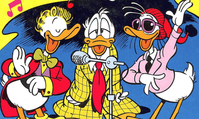 La prima è del 1988, si intitola “Paperinik e il Festival di Sanromolo” ed è contenuta nel Topolino 1682. Gli autori sono Bruno Sarda e Giorgio Cavazzano. La storia, che vede Paperinik alla caccia del ladro del disco d’oro, premio per il vincitore del festival, contiene tra le altre una curiosa parodia del trio Tozzi-Morandi-Ruggeri (vincitori del festival nell’87), interpretati rispettivamente da Gastone, Paperino e Paperoga. I tre cantano un pezzo scritto da Zio Paperone intitolato “Si può guadagnare di più”.