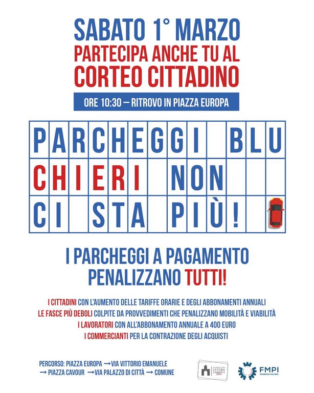 L’appuntamento è per sabato 1° marzo alle ore 10.30 in Piazza Europa, luogo di partenza della manifestazione di contestazione dal titolo “Parcheggi blu Chieri non ci sta più”. Il corteo percorrerà via Vittorio Emanuele, Piazza Cavour, Via Palazzo di Città snodandosi fino all’arrivo innanzi al Municipio ove avranno luogo il raduno e le dichiarazioni di partecipanti e organizzatori.