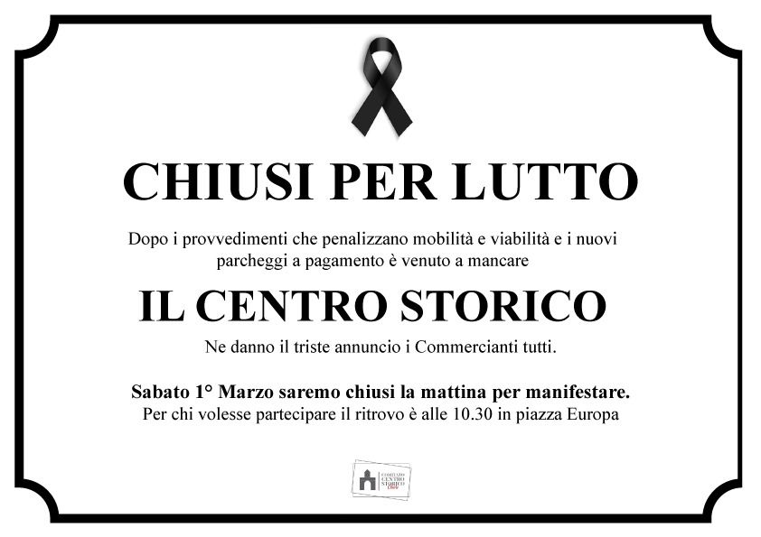 Prevista una grandissima partecipazione di residenti e commercianti del centro storico per sottolineare in presenza l’iniquità del provvedimento: che, in un contesto apolitico e apartitico, hanno già provocatoriamente provveduto ad affiggere sulle proprie vetrine facsimili di manifesti funebri per annunciare la serrata delle saracinesche il giorno della manifestazione.