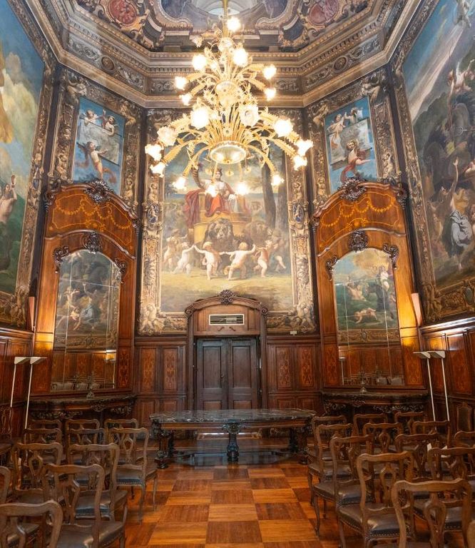 Degni di nota sono gli splendidi mobili, i rivestimenti settecenteschi in legno e un imponente lampadario in raffinato vetro di Murano.