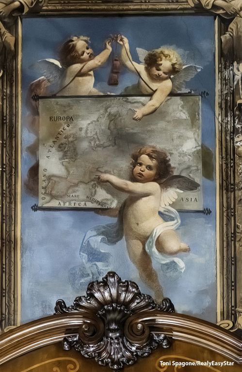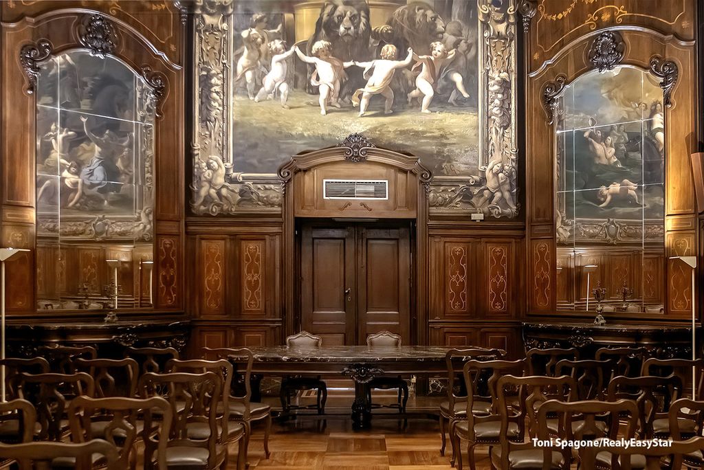 L’arredamento della sala è altrettanto spettacolare: mobili d'epoca, rivestimenti in legno del Settecento e un magnifico lampadario in vetro di Murano contribuiscono a rendere l'ambiente unico e affascinante.