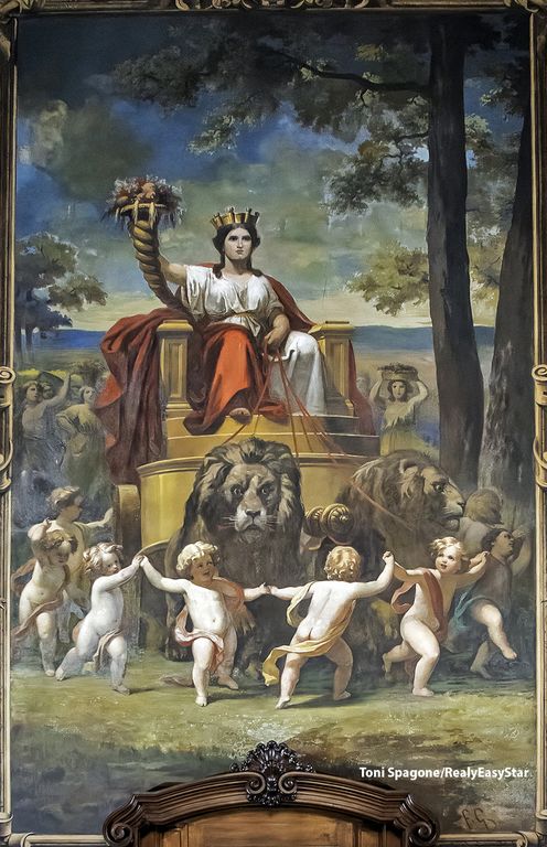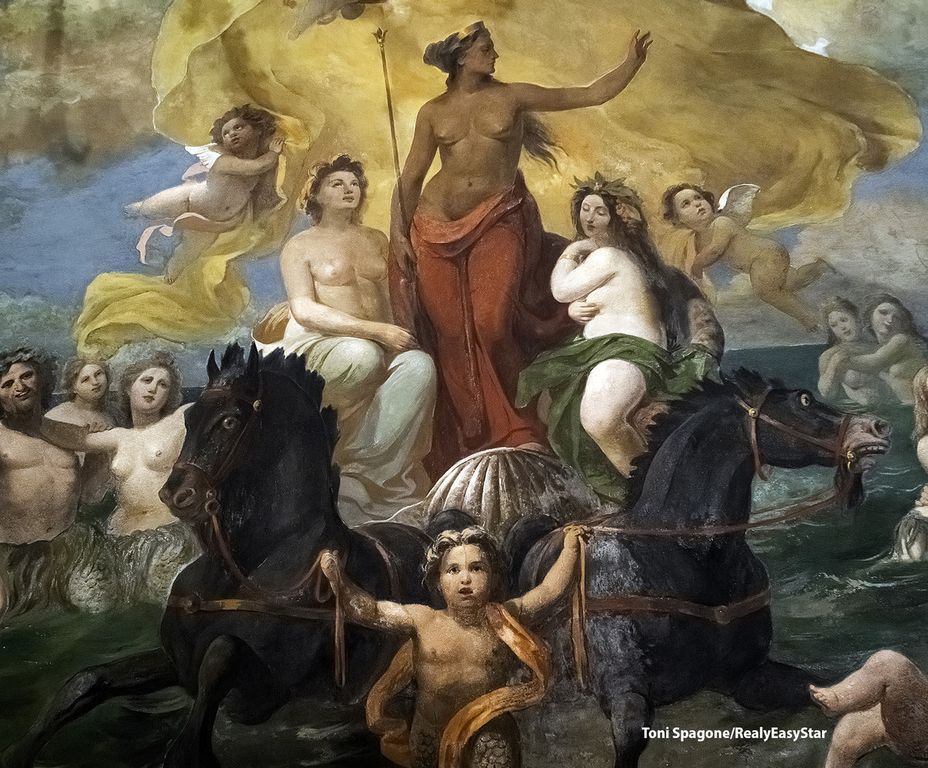 Entrando nella Sala Gonin, si viene immediatamente avvolti da un'atmosfera di eleganza e raffinatezza. Gli affreschi con effetto trompe l'œil creano l'illusione di un cielo aperto tra colonne e capitelli, mentre angeli sorreggono mappe dei quattro continenti agli angoli della sala. Le figure mitologiche rappresentano gli elementi della natura, come l'acqua, la terra e il fuoco, in un tripudio di colori e dettagli.