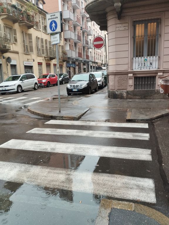 Basta un po' di pioggia e l'incrocio diventa una trappola per carrozzine e passeggini. Ma, in fondo, anche per i pedoni. Una situazione che si ripete spesso e volentieri a San Salvario, in quei punti dove il Comune - per facilitare l’attraversamento di vie a persone con disabilità motorie o semplicemente per passeggini o carrelli di trasporto merci - ha dotato una buona parte di marciapiedi di prolungamenti a scivolo detti “Nasi”. In corso Marconi quanto in via Baretti.