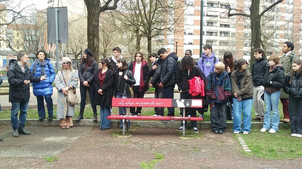 I discorsi delle diciassettenni Sara e Giulia, portavoci per le due classi, hanno colpito per la lucidità e la profondità delle riflessioni: il loro lavoro si è concentrato sulla denuncia della mercificazione del corpo femminile, sull'autoderminazione delle donne nel riprendersi la propria libertà e sul segno indelebile che la violenza lascia nei corpi, nella memoria e nei luoghi. Giulia, infatti, racconta che l'opera rappresentata nella panchina si riferisce alla storia di una sua amica che non poteva più avvicinarsi neppure al luogo in cui aveva subito un abuso. La consapevolezza che fare la propria parte con il proprio impegno possa fare la differenza, emerge quando Giulia dice "più panchine Rosso Indelebile facciamo, più donne salviamo".