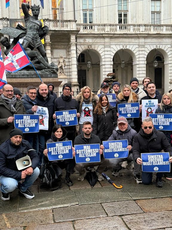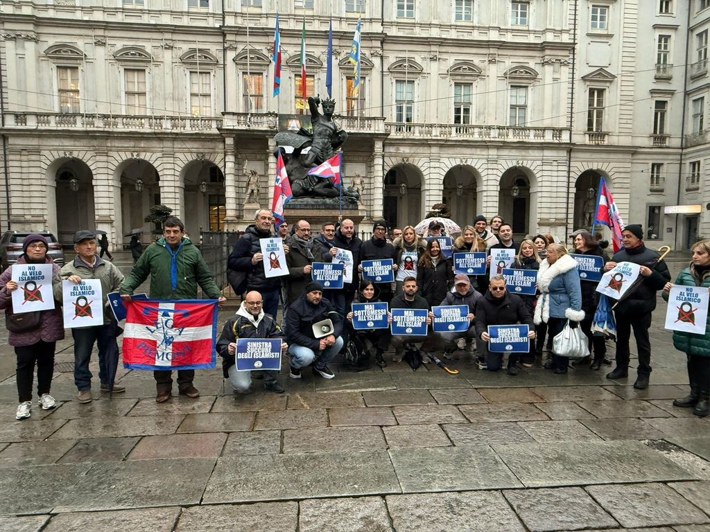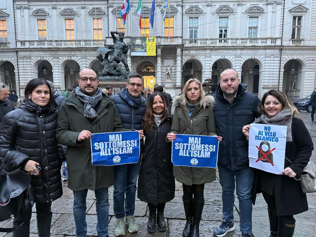 Flash mob della Lega nel pomeriggio di oggi, sabato 22 marzo, davanti a Palazzo Civico, "contro il velo e lo sportello anti islamofobia che il sindaco vuole aprire in città".