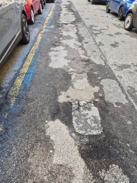 Qui la strada in molti tratti è ridotta ad un colabrodo, con avvallamenti e tratti sconnessi chi mettono a rischia l'incolumità di pedoni e veicoli. Lo scorso 10 marzo sono stati fatti interventi di sistemazione della strada. Ma, come denuncia Firrao con una foto, "riusciamo perfino a seppellire sacchetti di plastica sotto l’asfalto, durante la colmatura di una buca".