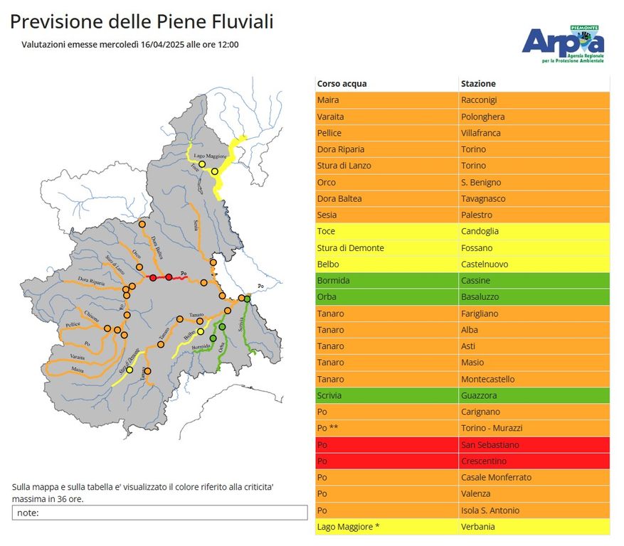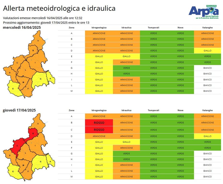 In particolare, per quanto riguarda la provincia di Torino, saranno in rosso le aree comprendenti le Valli Orco, Lanzo e bassa val Susa, Sangone e Val Chiusella. In rosso anche le province di Novara, Vercelli Val Sesia e Cervo.