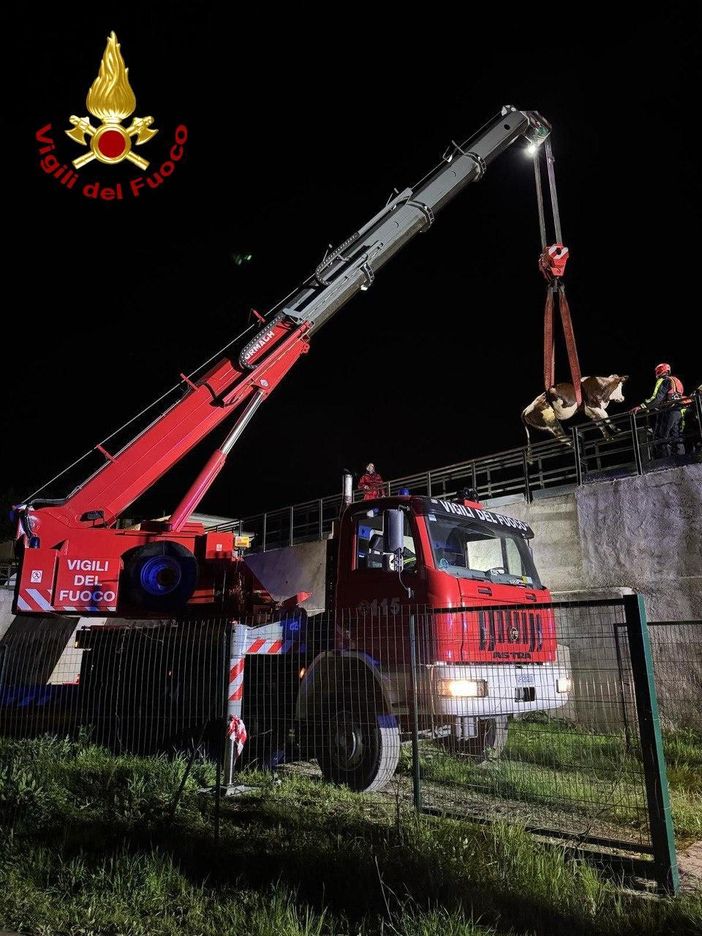 Cade nel canale della centrale idroelettrica, mucca salvata dai pompieri