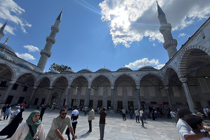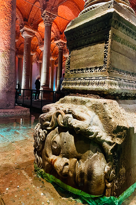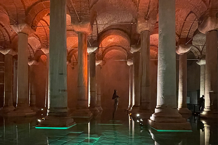 Una volta sulla riva europea, il tono cambia. La Moschea Blu, con le sue cupole armoniche, è nascosta da restauri che sembrano infiniti. Si intravede, come un volto dietro un velo. Poco distante, Santa Sofia racconta il passaggio della storia: chiesa, moschea, museo e di nuovo moschea. Oggi è accessibile solo dal piano superiore per i non musulmani. Il contrasto tra i fedeli in preghiera e i visitatori rumorosi dice molto del presente. Il pavimento in marmo, le calligrafie dorate, i mosaici bizantini creano un’atmosfera sospesa tra fede, arte e potere. Poi si scende, sotto terra, dove si nasconde una delle sorprese più emozionanti: la Basilica Cisterna. Le colonne si mostrano imponenti, la luce è tenue, l’atmosfera quasi mistica. Si ha l’impressione di entrare in un mondo parallelo, un luogo protetto, dove il tempo si è fermato. Le gocce d’acqua cadono dal soffitto ritmicamente e l’eco dei passi accompagna la visita, in un silenzio che parla. È uno dei luoghi più intimi della città, un invito alla lentezza, alla riflessione. Qui Istanbul non si mostra, si lascia sentire. Il Gran Bazar, con le sue cupole e i suoi corridoi affollati, oggi è più una scenografia che un mercato vivo. Ha perso parte delle sue origini. Le voci autentiche si confondono con i richiami costruiti per il turista, i prezzi sono gonfiati, le contrattazioni spesso inscenate. È un luogo che affascina più per la sua architettura che per la sua funzione: uno spettacolo visivo, più bello da vedere che da vivere.