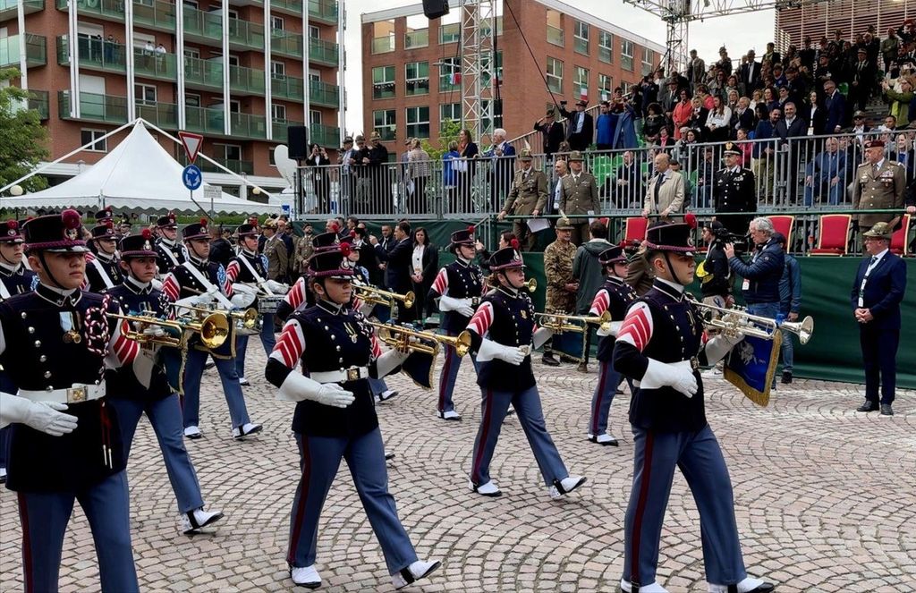 Sulle note della Fanfara della brigata alpina Taurinense – è passato in testa il 3° reggimento alpini della Brigata Alpina Taurinense, con due compagnie in uniforme da combattimento, precedute dalla bandiera di guerra, tra le più decorate dell’Esercito.